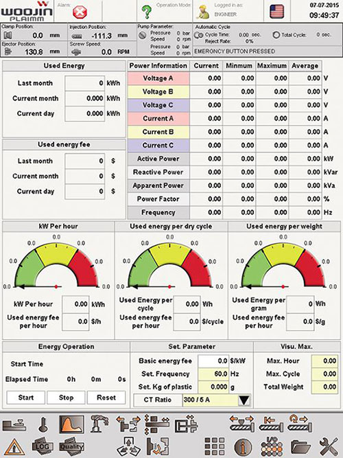 Presentación precisa de la energía necesaria, referida a todo el tiempo de producción. Esto hace que sea más fácil asignar el consumo de energía por ciclo. El tiempo de producción total y el consumo total de energía pueden mostrarse y utilizarse para calcular automáticamente el consumo de energía por ciclo y la energía utilizada por pieza. El consumo de energía en tiempo real también se puede mostrar.